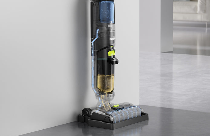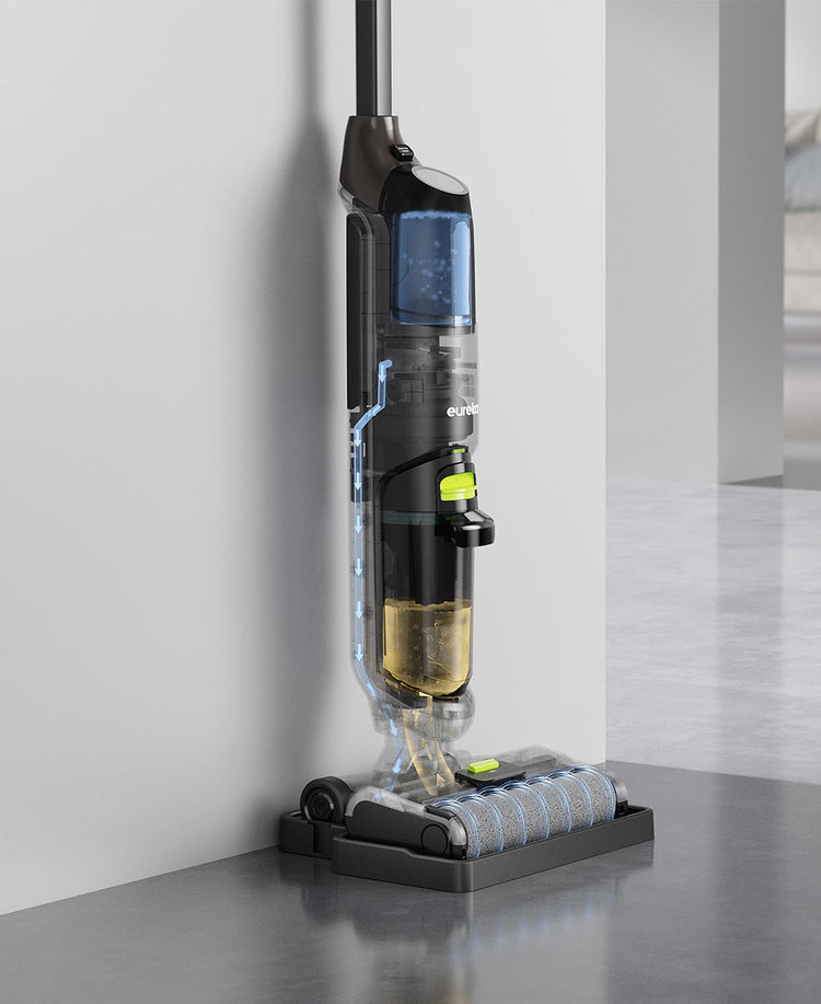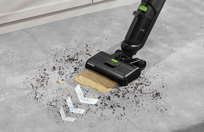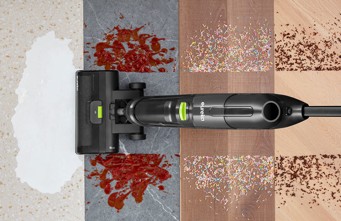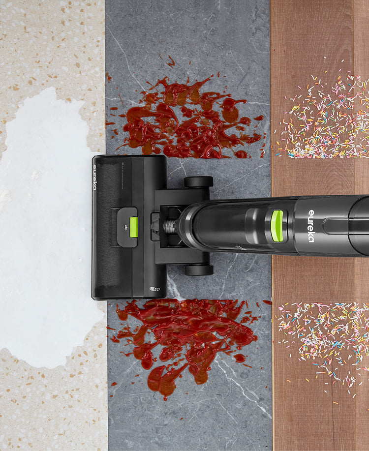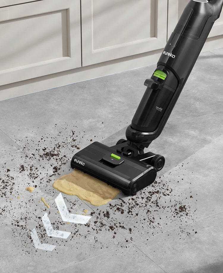Fuerte succión del combo de aspiradora y fregona inalámbrica EUREKA puede ayudar a quitar desechos y manchas de suelos duros, mármol y cerámica en la cocina, recámara y baño, entre otros lugares.