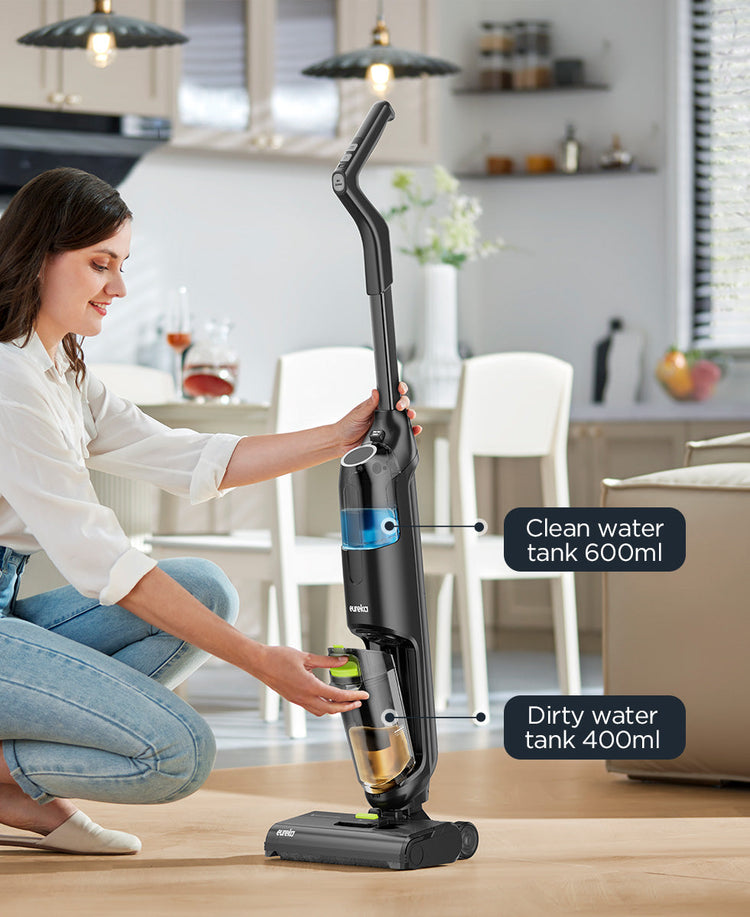 - SAVES TIME AND EFFORT: Vacuum and wash at the same time. EUREKA NEW400 cordless floor washer Is an effective way to clean wet and dry messes on multiple sealed hard floors, including hardwood, tile, laminate, vinyl, and marble.