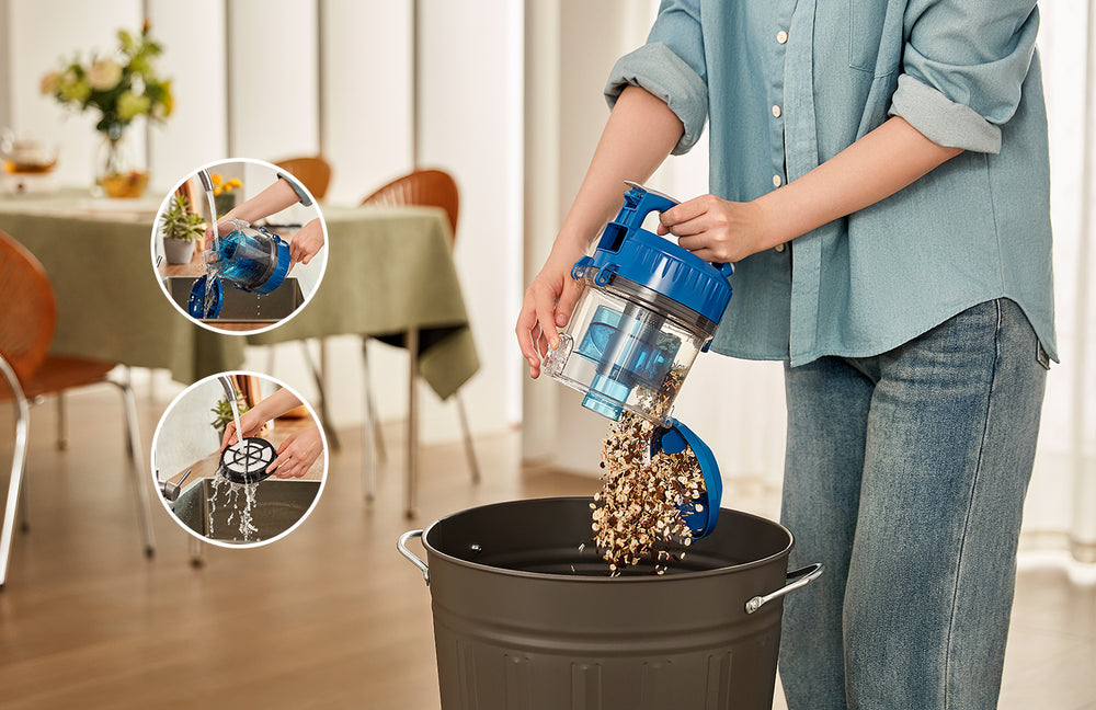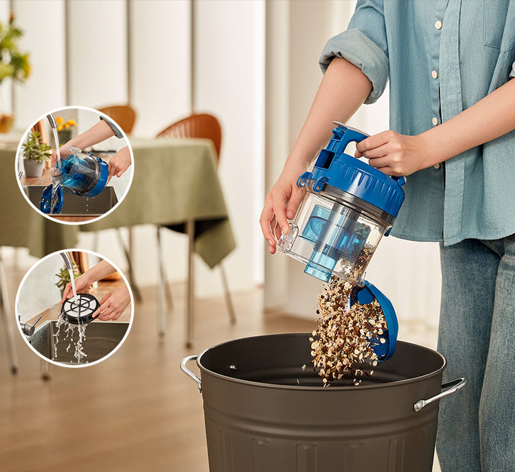 Diseño sin bolsa con un depósito de polvo de fácil vaciado, sin necesidad de comprar bolsas ni correas, y los filtros son lavables.